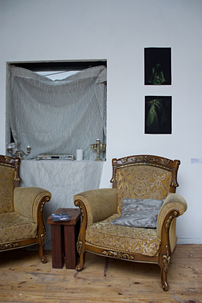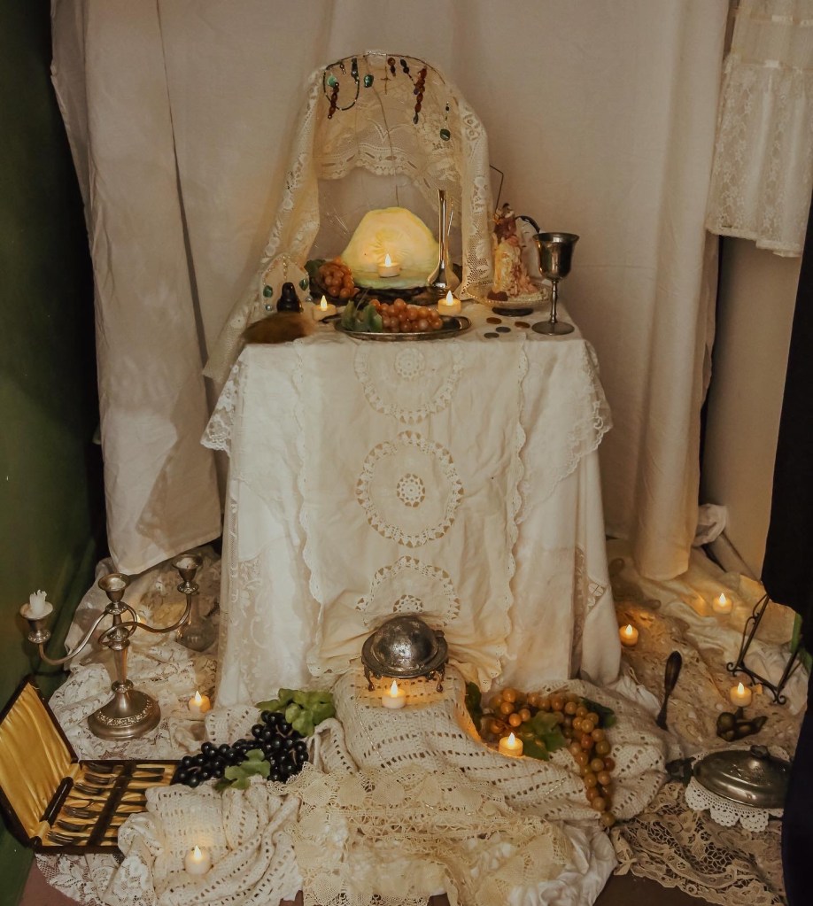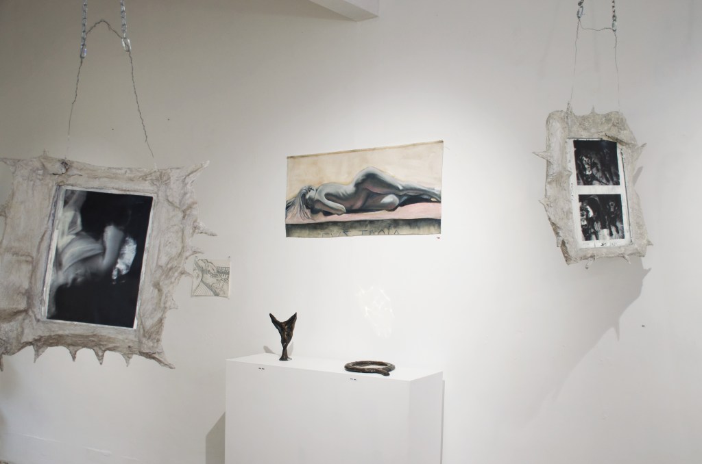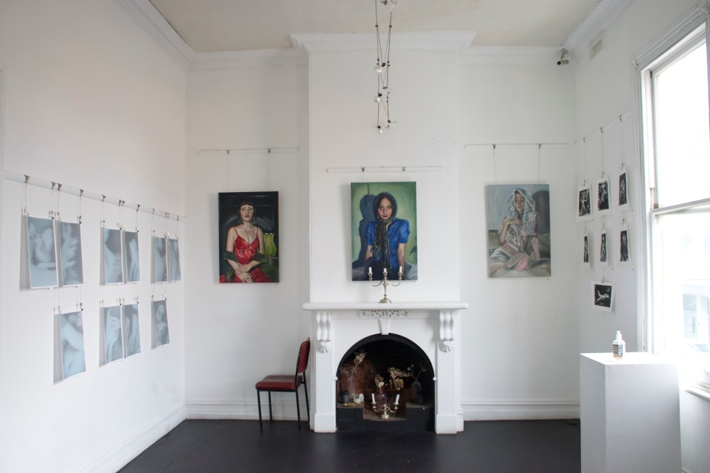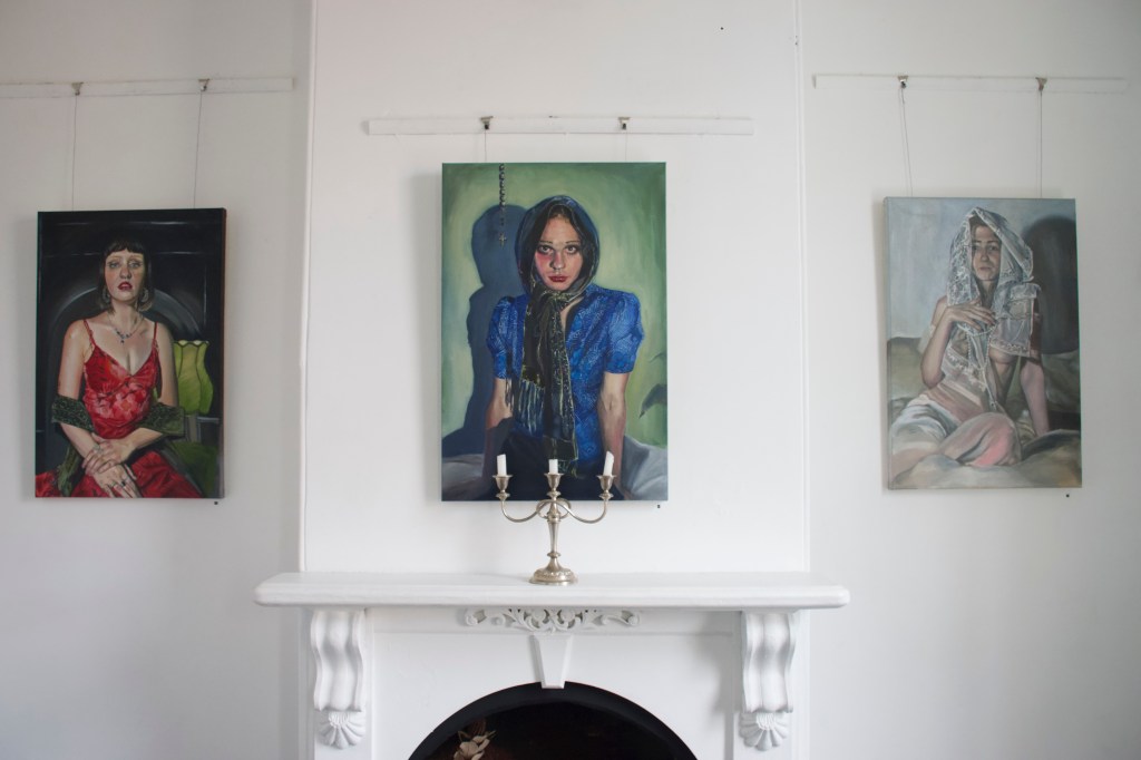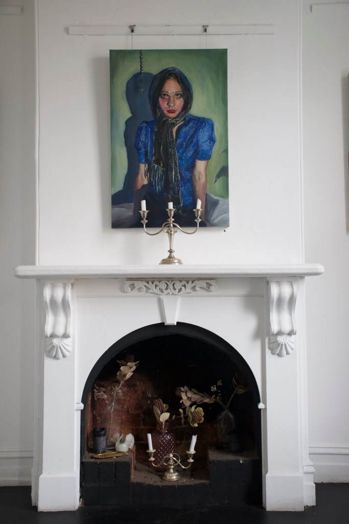Gabriella’s solo paintings and sculpture explore a reconnection to religious frameworks in adult life, through experiences of grief. Her focus on the symbolic and decorative highlights the beauty found in the Greek Orthodox tradition, while tainted with aesthetics of decay which further represent the underlying sociopolitical tensions.