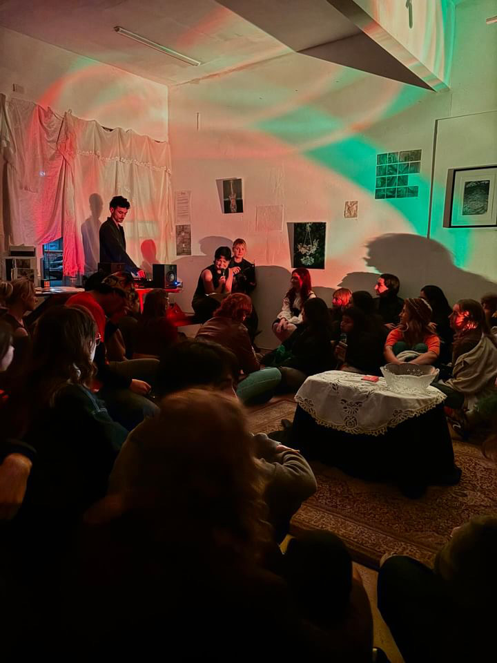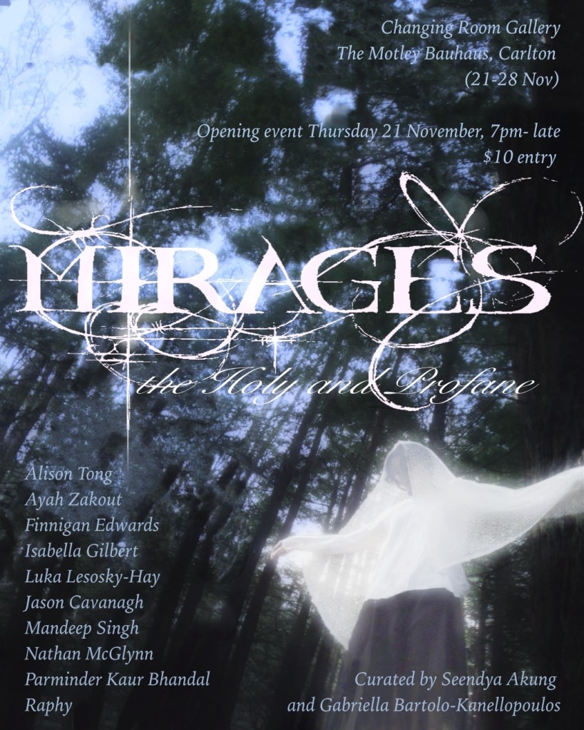 Mirages unites a cohort of artists operating within one inner-northern bohemian scene, but nevertheless demonstrating manifold relationships to and experiences with religion. We all share in our settlerhood yet are borne from a diversity of traditions. Australia boasts being secular nation, albeit with Christian undertones, and a spiritual cynicism pervades social discourse. As we take secularisation as a core mood of contemporaneity, we grapple with our disconnect to tradition, culture, and spirituality. What role does religion truly have in our lives, when we choose not to ignore it? If we acknowledge its presence, or lack thereof, in our autobiographies; will it lead to deeper appreciation for all traditions and practices, especially those rooted in the land we occupy? The condition of living in a settler-colony is the gradual separation from and bastardisation of imported religious traditions, which no longer can take root in their traditional home-place.