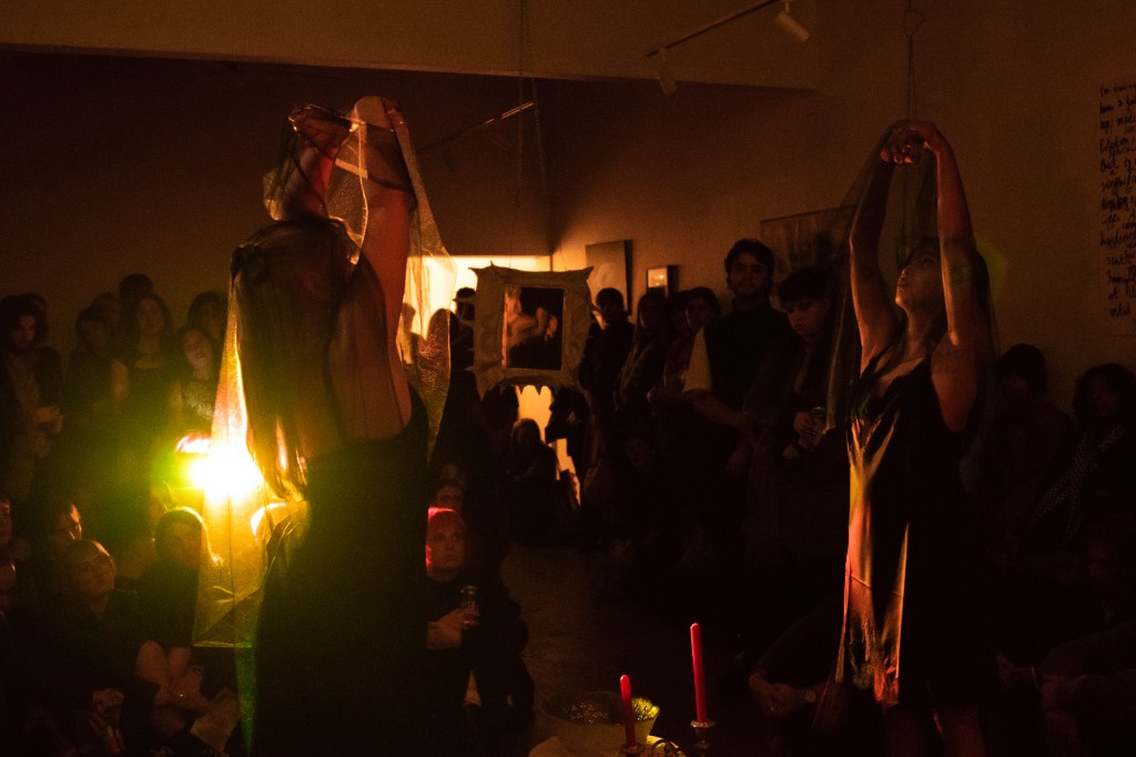 Alison, Isabella, and Finnigan collaborate on a durational performance reflecting on the dancers’ interpretations of Christianity from afar, with a soundscape exploring eastern and western sonics and their connection to religion and culture. Structurally, the performance interprets elements from Catholic church services and rituals shared between faiths, such as a communion, procession, feast, and pilgrimage.