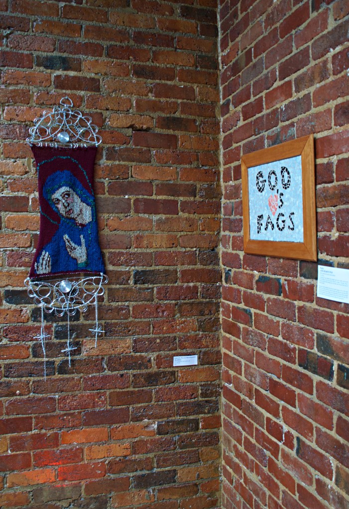 Raphy’s mosaics are a reaction to the unabashed tradition of homophobia within the Christian church. Within, the literally ugly expression of bigotry through slogans which characterised his childhood in the early 2000s, are transmuted into decorative works, reclaiming senses of beauty and wonder from these same sources.